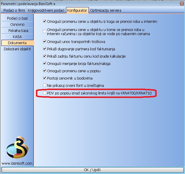 U konfiguratoru postoji sada opcija po kojoj sam klijent određuje kako će da mu knjiži otpis iznad zakonskog limita. Ako je opcija štiklirana, knjiži na KRN4700/KRN4710 u protivnom ide na KRN4740/KRN4750.