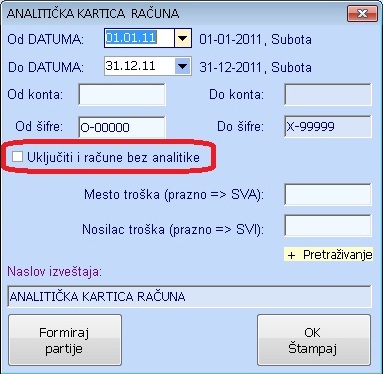 Izveštaji iz finansijskog – Analitička kartica računa – Ubačena je nova funkcija (checkbox) koji kada je štikliran na ovom izveštaju prikazuje i račune koji se ne vode analitički i/ili nemaju analitiku. Ovim izveštajem se sada mogu dobiti sva konta sa prometom i analitike konta sa prometom.