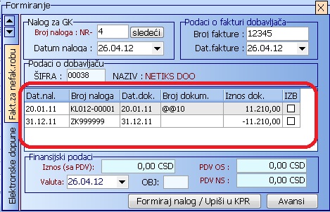 Obrada naloga glavne knjige – Prijem fakture za nefakturisanu robu – Sada je moguće izabrati više ulaznih kalkulacija koje se zatvaraju jednom fakturom za nefakturisanu robu (naravno, podrazumeva se da su kalkulacije označene da su za nefakturisanu robu).