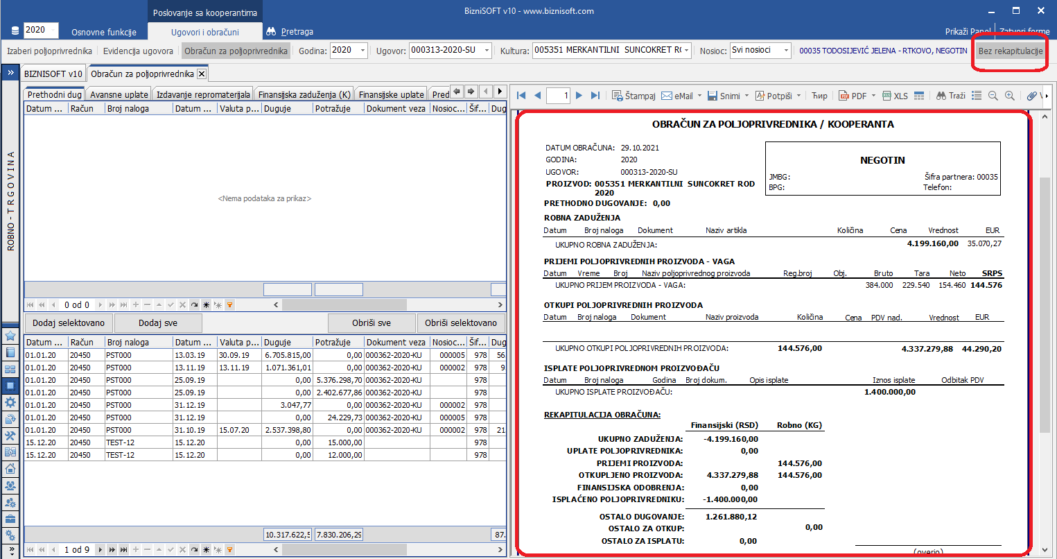Dodata je nova opcija [bluetext]Bez rekapitulacije[/bluetext] u [bluetext]Obračunu za poljoprivrednika – Poslovanje sa kooperantima[/bluetext], koja sadrži samo zbirne iznose: