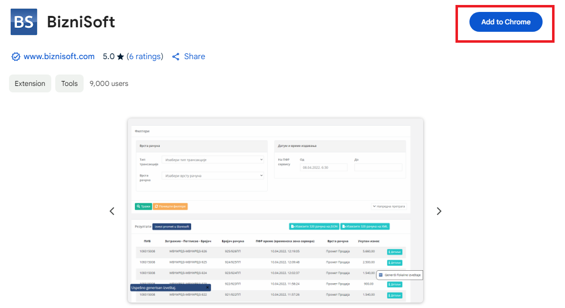 U cilju automatizacije pojedinih poslovnih aktivnosti, razvili smo ekstenziju (dodatak) za Chrome, Edge, Opera i druge kompatibilne pretraživače koja korisnicima omogućava neke dodatne funkcionalnosti na raznim portalima od interesa za poslovanje u Republici Srbiji. Ekstenzija je besplatna i mogu je koristiti i oni koji nisu korisnici BizniSoft poslovnog programa. Portali na kojima su omogućene dodatne funkcionalnosti su: