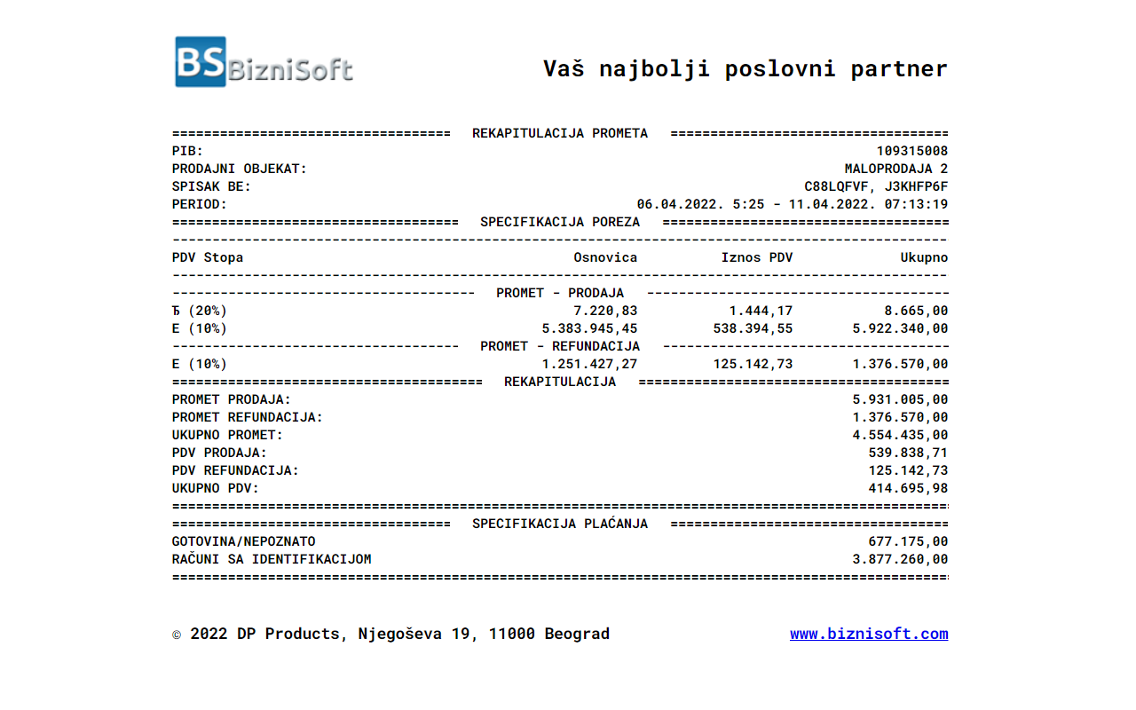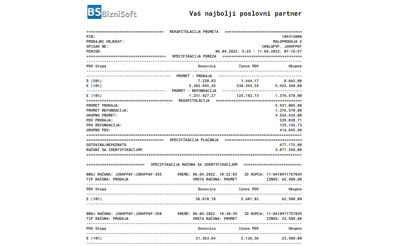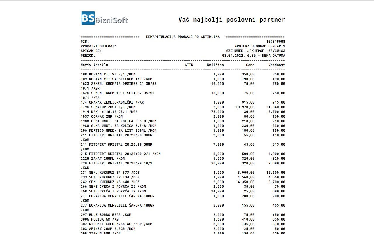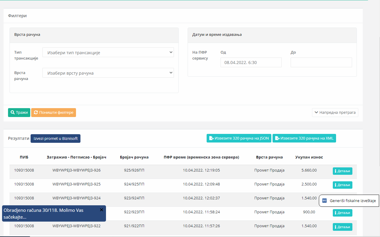 BizniSoft dodatak omogućava štampanje izveštaja prometa (fiskalnih izveštaja) na portalu Elektronskih servisa za fiskalizaciju (ESF) kao i eventualni uvoz podataka u BizniSoft. Fukcija pregleda i štampe fiskalnih izveštaja namenjena je svim obveznicima fiskalizacije a funkcionalnost direktnog uvoza podataka u poslovni program je namenjena samo za korisnike BizniSoft-a. Detaljno korisničko uputstvo dostupno je na ovom linku.